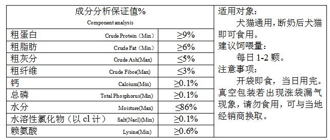 配料表:75%冰鮮鴨肉、蛋黃、金瓜、胡蘿卜、西蘭花、蓮藕、南瓜籽、土豆、枸杞、微量元素、維生素。